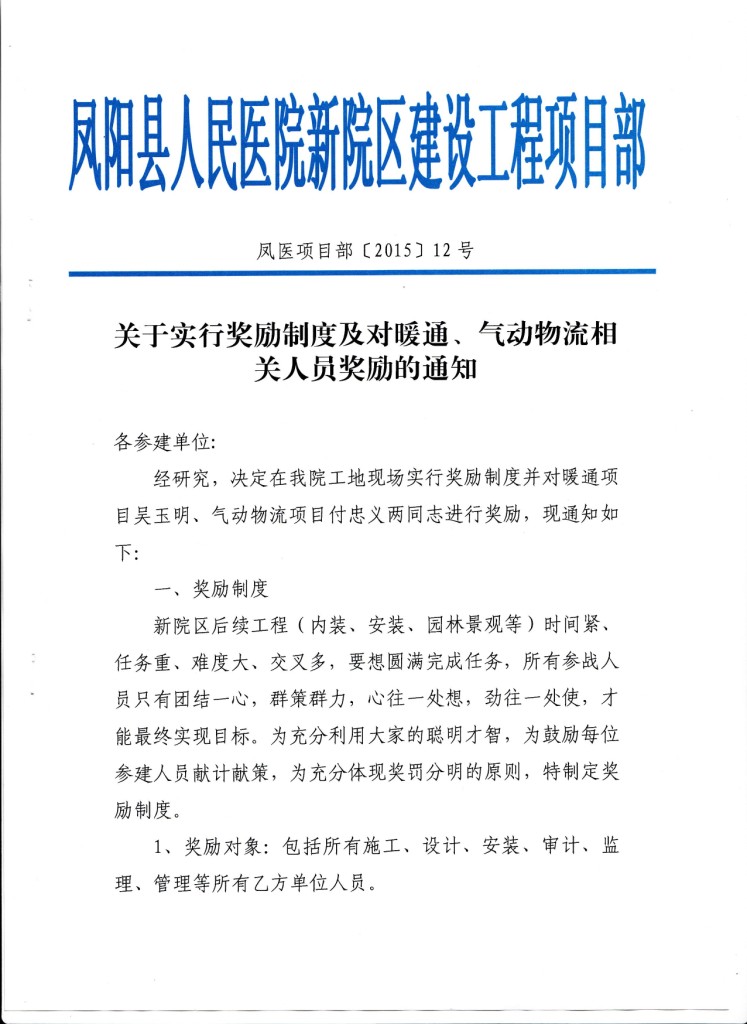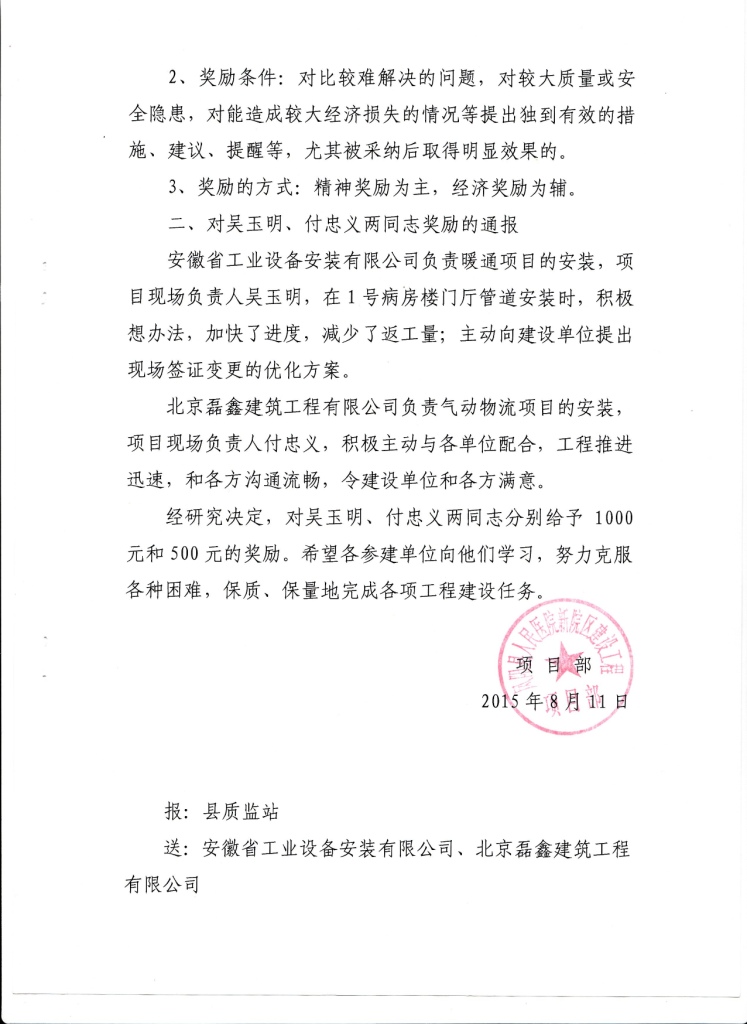 8月11日,鳳陽縣人民醫(yī)院新院區(qū)建設(shè)工程項目部發(fā)來賀文,就公司第九分公司承攬的鳳陽縣人民醫(yī)院新院區(qū)暖通項目安裝工程表示肯定,并對該項目的現(xiàn)場負責(zé)人吳玉明同志給予表彰和獎勵通報。