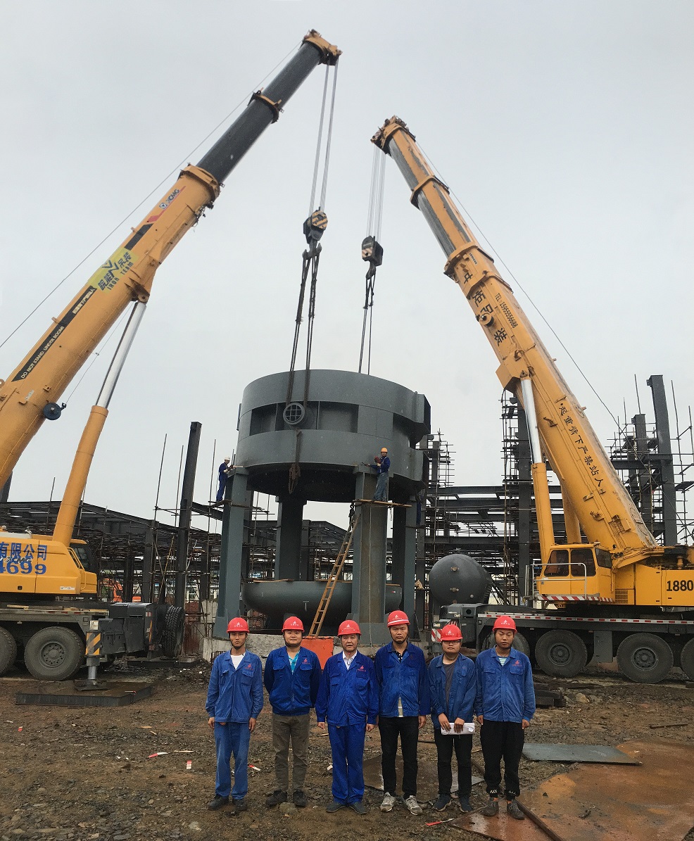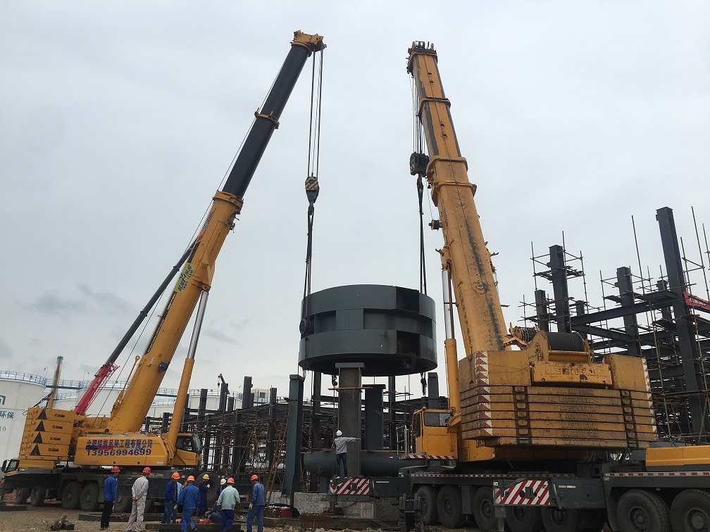 本次吊裝的反應(yīng)器中段部分重達220噸,分公司領(lǐng)導(dǎo)高度重視,吊裝前期,邀請公司總工吳繼成、總工辦主任牛守義和安全部王岳濤經(jīng)理親臨項目部參與設(shè)備吊裝的專題方案討論定稿工作。當(dāng)日上午,吊裝現(xiàn)場準備工作緊張卻又有條不紊的進行,項目經(jīng)理李子鳳向全體“參戰(zhàn)”員工進行了安全交底,工作人員對兩臺分別為500T、350T吊車的站位及性能再次確認,現(xiàn)場機具、人員均按既定方案實施。分公司經(jīng)理史崇松、業(yè)主單位負責(zé)人、監(jiān)理全程在現(xiàn)場“督戰(zhàn)”,全體工作人員經(jīng)過四個小時的奮戰(zhàn),吊裝作業(yè)圓滿結(jié)束。