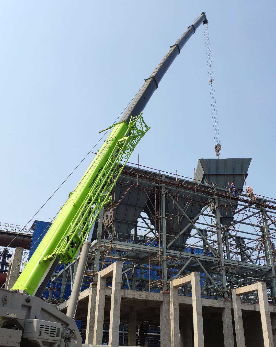 本次吊裝的反應(yīng)器灰斗部分總重量達(dá)56噸,吊裝作業(yè)存在場地狹小、與土建單位交叉作業(yè)多、吊重荷載大等諸多困難,吊裝任務(wù)異常艱巨。為此,項目部提前合理部署,多次優(yōu)化吊裝方案,按照方案要求采用額定荷載為100噸的汽車實施吊裝作業(yè)。項目部在設(shè)備吊裝前對全體“參戰(zhàn)”人員進行了現(xiàn)場安全技術(shù)交底,明確施工工序、技術(shù)要點難點和安全風(fēng)險點,做到分工明確、責(zé)任到位,吊裝工作有條不紊地展開。在各方力量的通力配合下,經(jīng)過六個多小時的奮戰(zhàn),項目部終于完成了10臺灰斗以及現(xiàn)場輔助設(shè)備的吊裝任務(wù)。