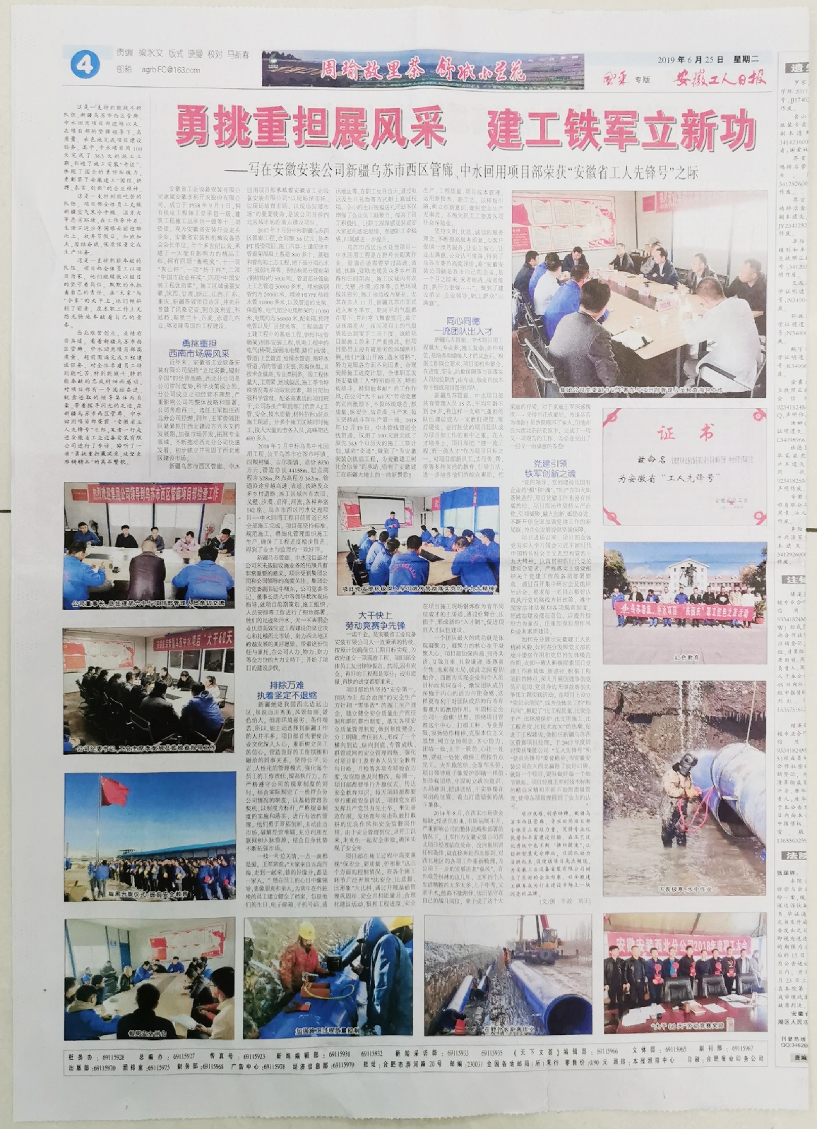 先進典型是時代精神的標桿,典型事跡報道是擴大傳播力的有效法寶。近日,《安徽工人日報》在風采專版的顯著位置以《勇挑重擔展風采,建工鐵軍立新功》為題刊發整版專題報道,記述安徽安裝新疆烏蘇市西區管廊、中水回用項目部榮獲“安徽省工人先鋒號”的典型事跡以及項目部團隊的幕后故事。