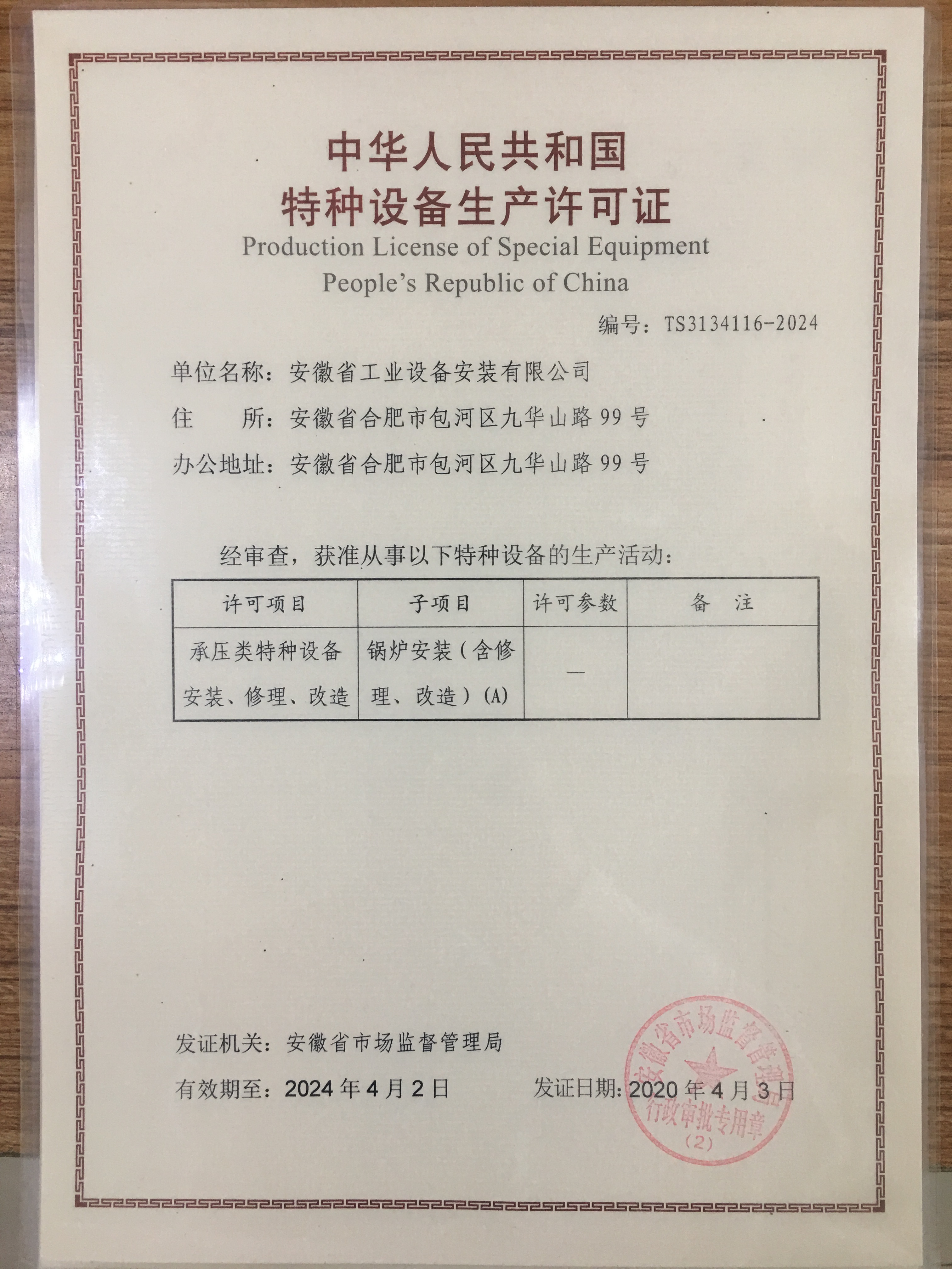 2020年4月3日,安徽安裝公司鍋爐(A級)安裝維修許可換證評審順利通過,該證書由安徽省市場監(jiān)督管理局發(fā)放。