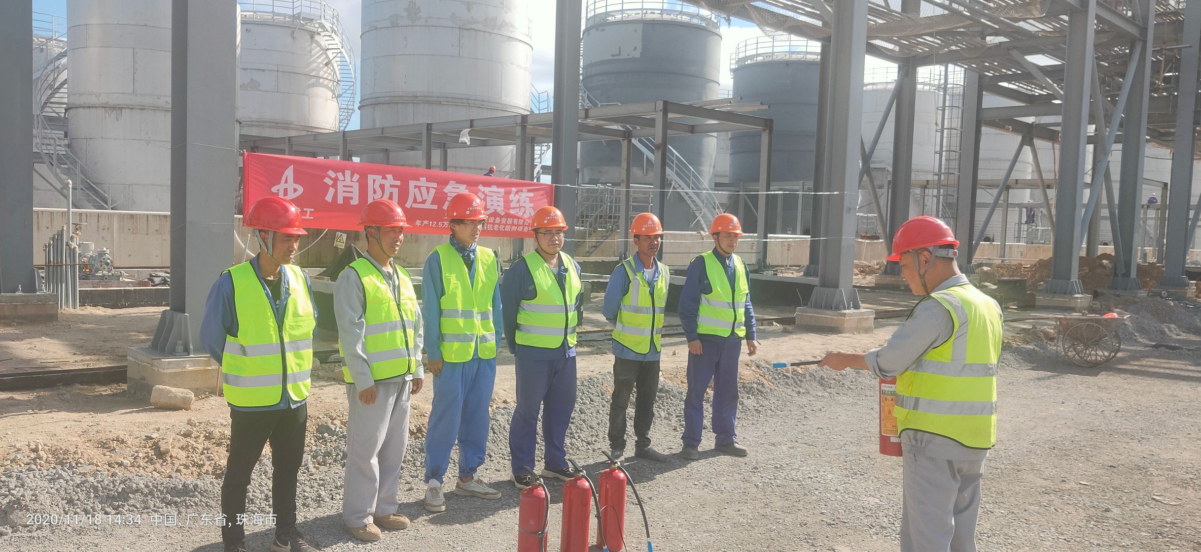 項目安全部負責人皮軍首先介紹了此次應急演練活動開展的相關要求及具體流程,重點對于滅火器材的原理、基本使用方法及相關注意事項進行了說明并親自進行了現場滅火示范操作。通過現場演練,皮軍進一步要求:一是項目部全員要提高思想認識,提高安全防御措施,把“安全責任重于泰山”牢記于心,對于所有動火區域操作按照規范進行。二是要及時進行危險源檢查、辨識、監控工作,夯實各項安全生產,做到安全隱患及時排查與監督。三是項目部要按照“預防為主、防消結合”的方針,加強安全生產法律法規及勞動安全知識的學習,提高應對突發事件的能力。