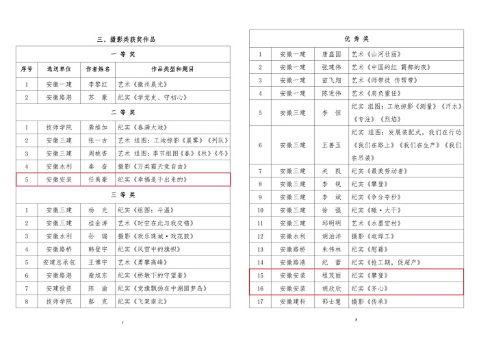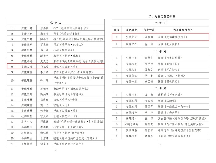 9月29日,集團(tuán)公司工會(huì)通報(bào)了“翰墨寫(xiě)初心 丹青頌黨恩”職工書(shū)畫(huà)攝影作品展評(píng)選結(jié)果,安徽安裝公司選送的五幅作品榜上有名。其中馬金鑫的油畫(huà)作品《支部建在項(xiàng)目上》榮獲繪畫(huà)類(lèi)一等獎(jiǎng),任禹豪的攝影作品《幸福是干出來(lái)的》榮獲攝影類(lèi)二等獎(jiǎng),化范寶的硬筆書(shū)法作品《沁園春·雪》和程茂麗的攝影作品《攀登》、胡欣欣的攝影作品《齊心》分別榮獲書(shū)法類(lèi)優(yōu)秀獎(jiǎng)和攝影類(lèi)優(yōu)秀獎(jiǎng)。