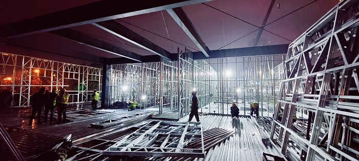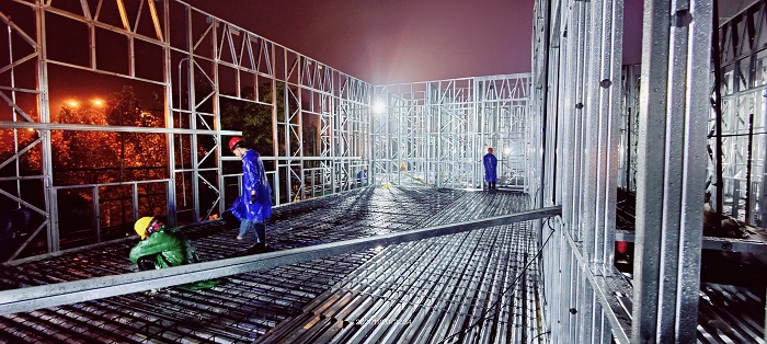 為搶抓工期,項目部迅速調集人力,自開工以來,項目一線施工人員一直保持在150人左右,采取24小時輪班制度,兩班倒的方式,“人歇工地不停”,在嚴格實施安全防疫的同時加班加點搶時間,趕任務,確保項目現場施工不斷推進,即使是在不利于施工作業的雨天,大家也合理安排施工計劃,主動放棄休息,在已經封頂的一層、二層結構中進行水、電、通風、內部裝飾等工作,全力以赴加快項目建設進度。