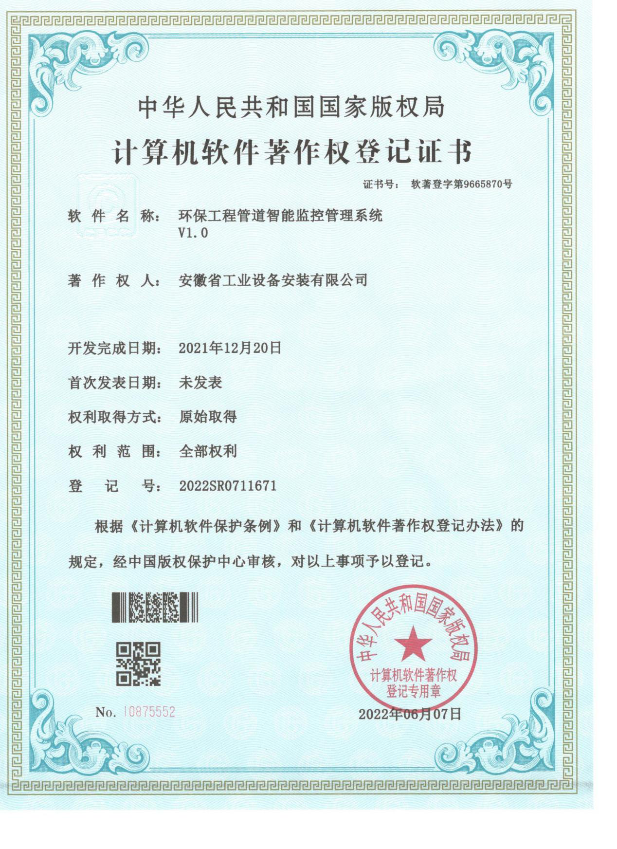 近日,經(jīng)國家版權(quán)局審核批準,安徽安裝公司申報的《環(huán)保工程管道智能監(jiān)控管理系統(tǒng)V1.0》喜獲計算機軟件著作權(quán)登記證書,這標志著公司在數(shù)字與信息化發(fā)展上實現(xiàn)新突破、邁上新臺階,開啟了數(shù)字化轉(zhuǎn)型新征程。