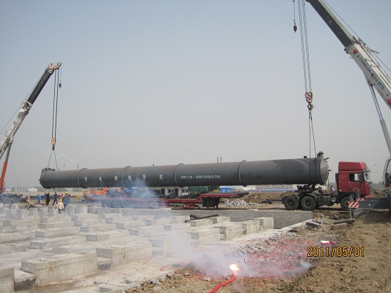 5月1日上午9時許,隨著一陣鞭炮聲響徹鳳陽僑裕新型建材有限公司施工工地,蚌埠分公司承建的鳳陽僑裕8臺蒸壓斧吊裝工作由此拉開了序幕。待安裝蒸壓斧單臺直徑2米、長32米、重約35噸。9點15分,隨著一聲號令,兩臺50T和70T吊車緩緩收鉤,在現場 “起臂、轉臂、扒臂、起鉤、落鉤”等手勢的正確指揮下,第一臺蒸壓斧就象一條巨龍騰空而起,9點25分穩穩地落在預定的位置上,至5月2日11時最后兩臺設備就位,順利完成了全部吊裝任務。本次吊裝作業由于項目部安排得當、組織有力、協調到位,整個吊裝作業安全規范,現場施工井然有序,安徽省安的專業施工能力再次得到檢驗!