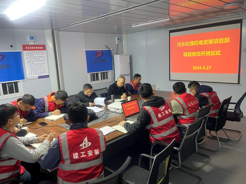 為加強項目人才隊伍建設,進一步提升項目團隊專業化水平,著力培養符合項目管理實際的復合型人才,打造學習型項目部,3月27日晚,蚌埠污水處理站項目“夜?!睂W習班正式開班,建工安裝蚌埠分公司經理、黨支部副書記趙銘亮為項目夜校開班進行了動員并親自授課,項目部全體人員參加。