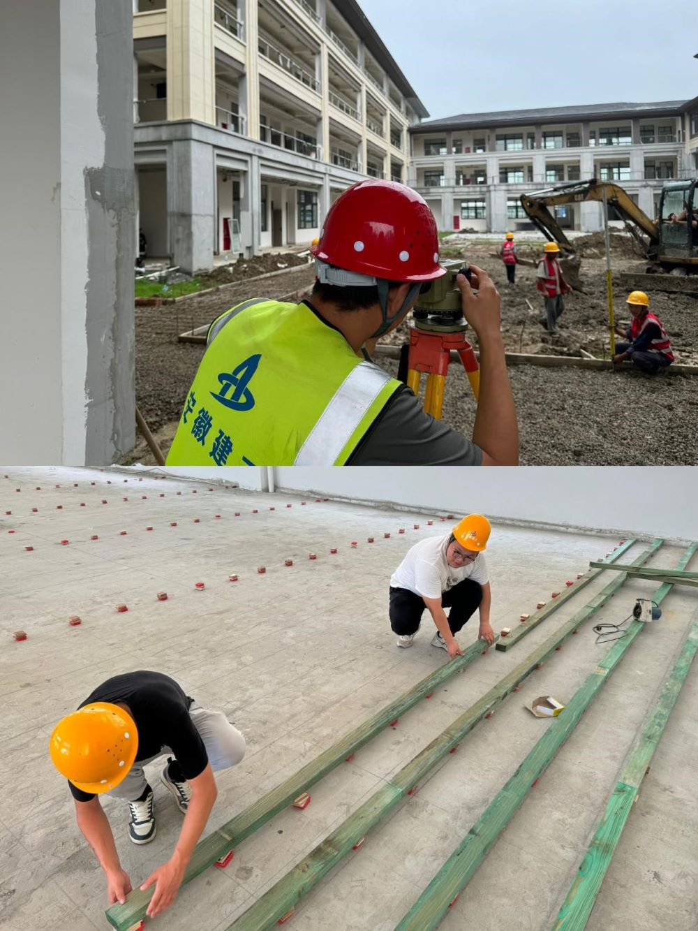 圖為4號樓內庭院鋪裝基層碎石整平、室內體育場運動木地板龍骨搭建