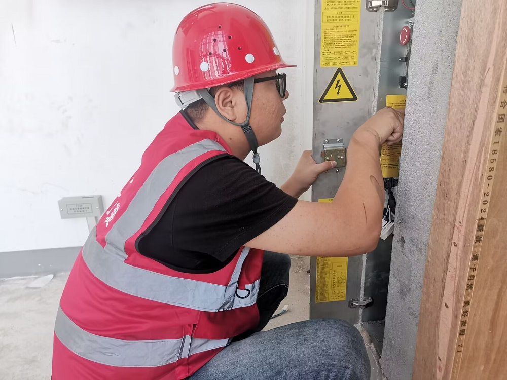 中國蚌埠傳感谷(寧波蚌埠微電子產(chǎn)業(yè)園)項目,技術(shù)員,鄭繼昊,正在檢查電梯控制柜操作系統(tǒng)。奮進正當時,我為祖國建設出力,以實際行動建設精品工程。我在項目堅守,我為祖國慶生。